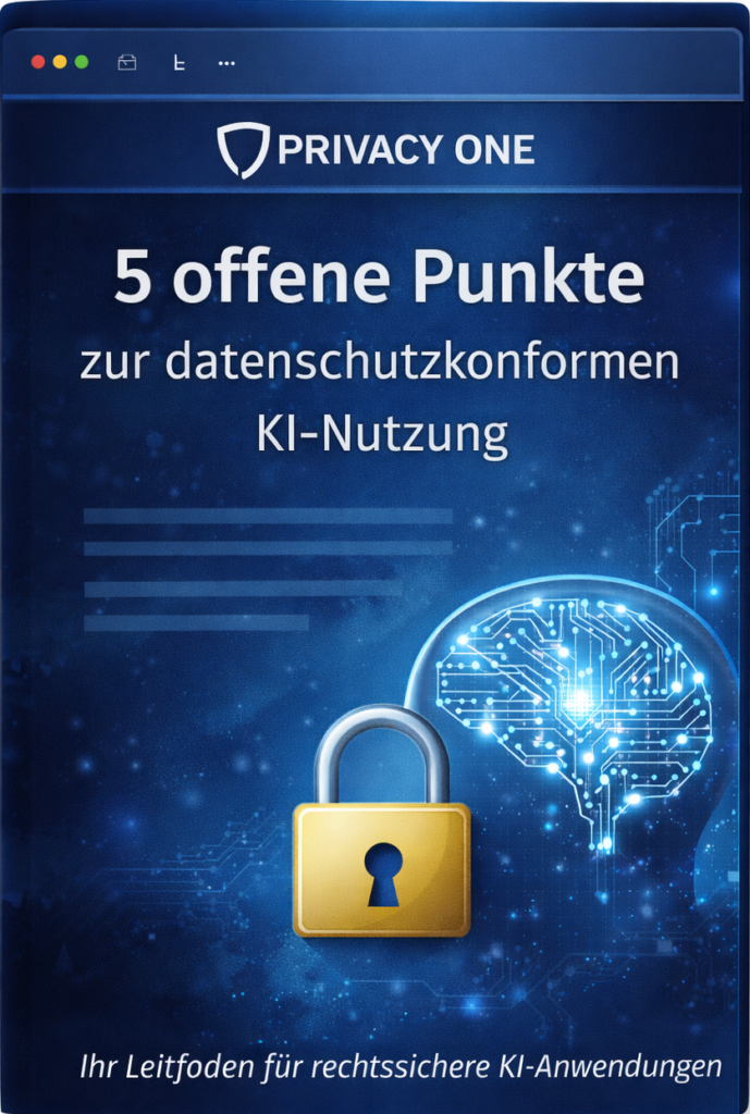PRIVACY ONE unterstützt Unternehmen und öffentliche Einrichtungen als externer Datenschutz-, KI-, Hinweisgeber- und Geldwäschebeauftragter. Wir übernehmen Analyse, Dokumentation, Überwachung und laufende Betreuung – persönlich, juristisch fundiert und ohne Software-Abos.
